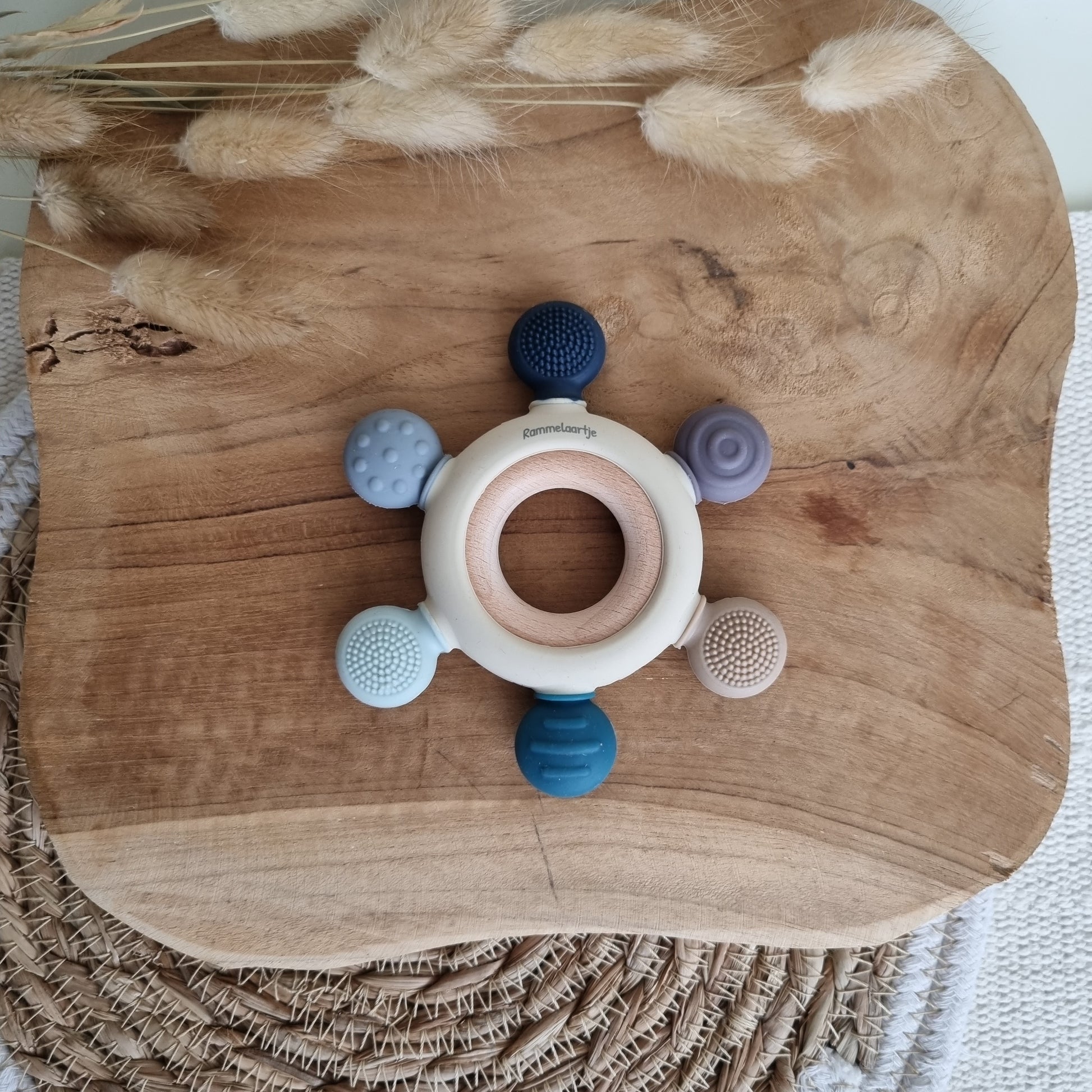 Bijtring Dental - Multicolor Blauw Siliconen Bijtring Met Beukenhouten ring