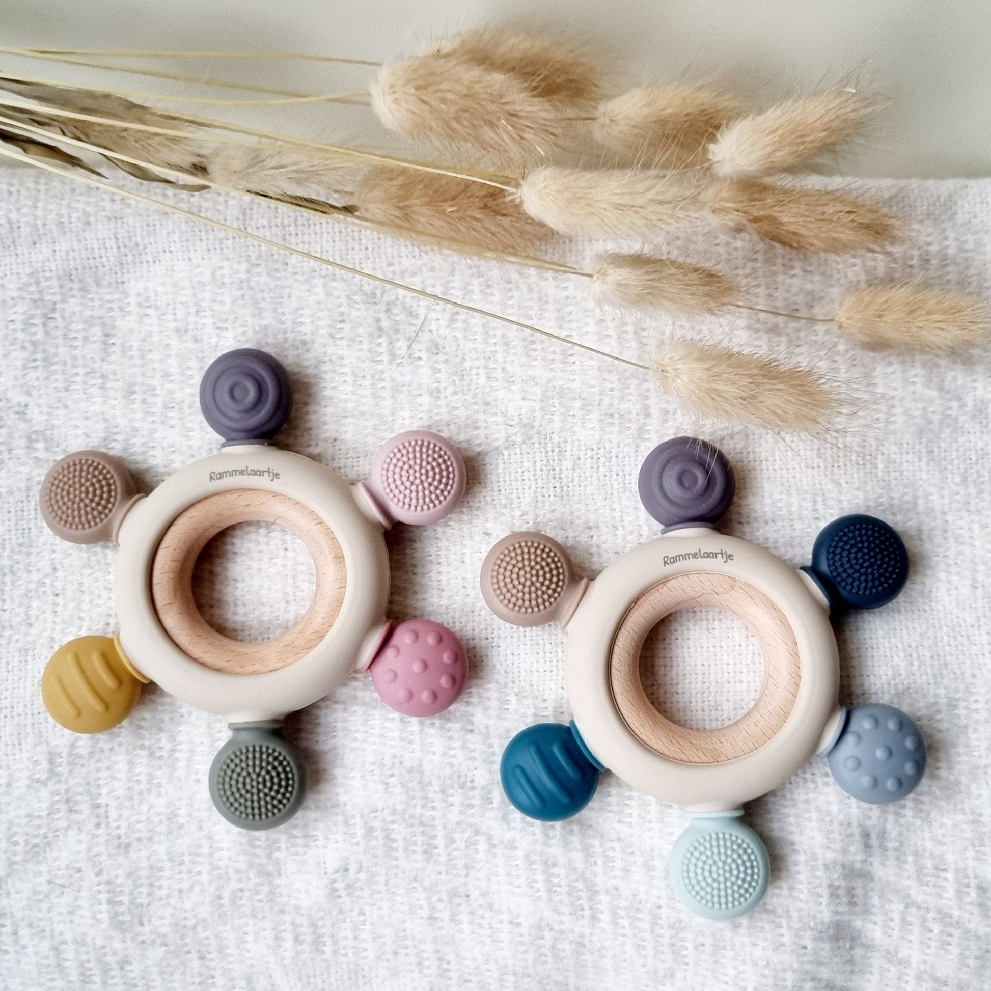 Deze stevige bijtring is echt een must-have! Het is gemaakt van een beukenhouten ring, en 100% babyveilige siliconen. Hierdoor is het flexibel, gemakkelijk vast te pakken, en erg fijn om op te bijten. Door het reliëf blijft het interessant en wordt het tandvlees gemasseerd.