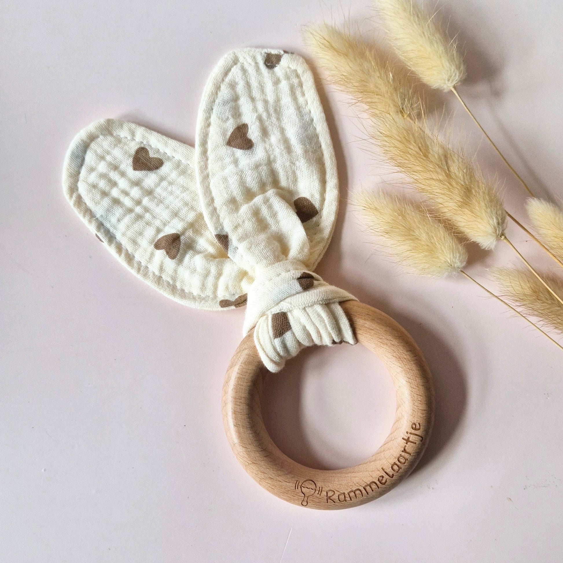 Houten bijtring met zachte konijnenoren 15cm - Hartjes