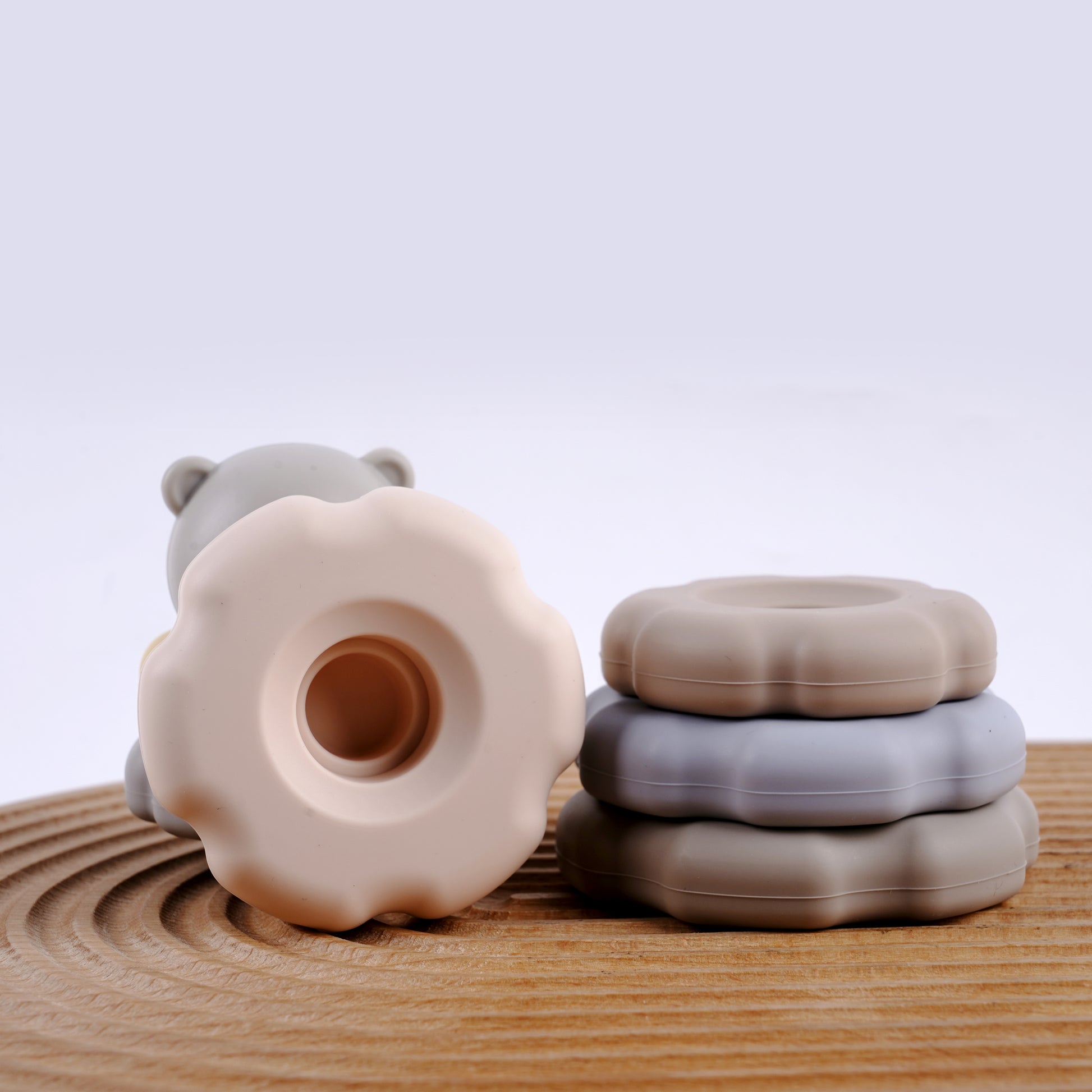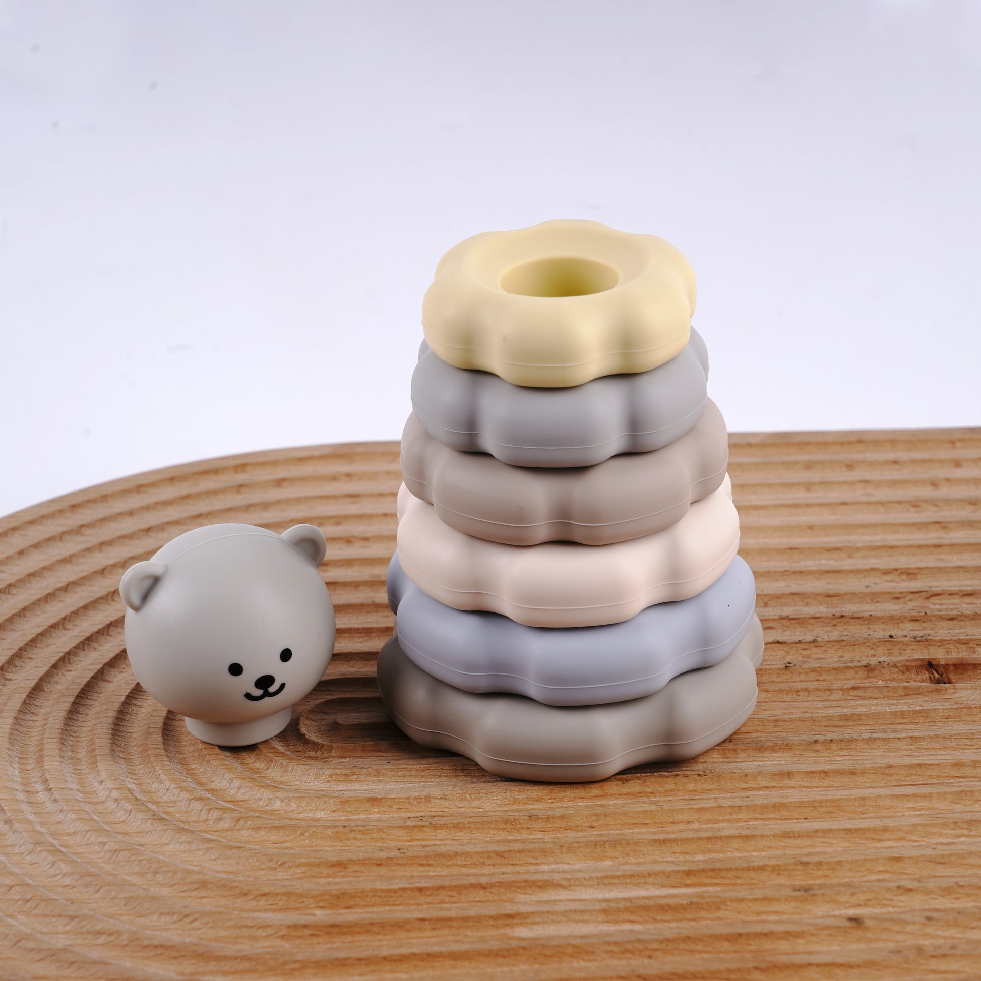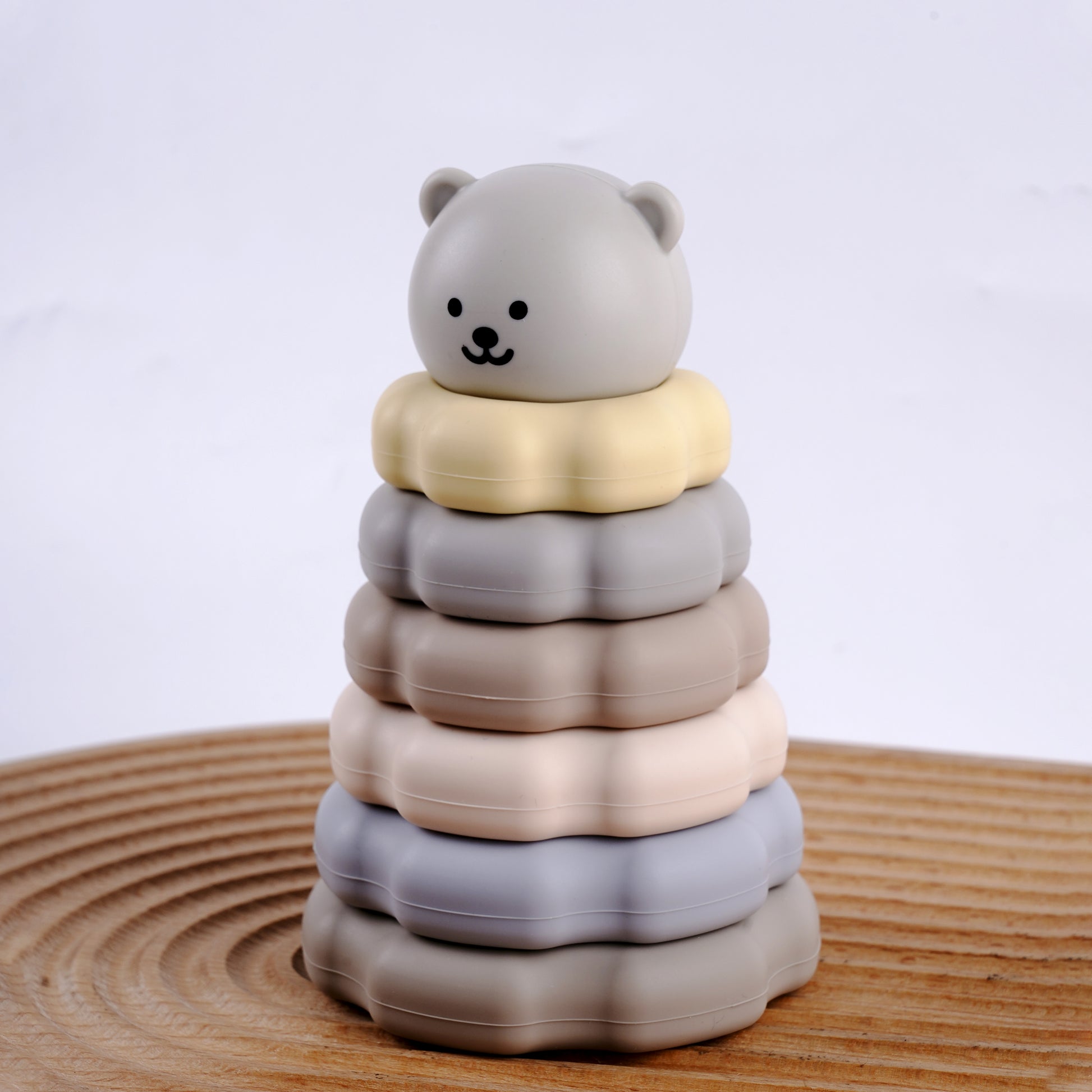 De stapeltoren bestaat uit meerdere bloemenring-vormen en een schattig beertje bovenop. Kinderen kunnen de ringen stapelen, sorteren, rollen en vasthouden — ideaal voor de ontwikkeling van motoriek, hand-oogcoördinatie en sensorisch spel.