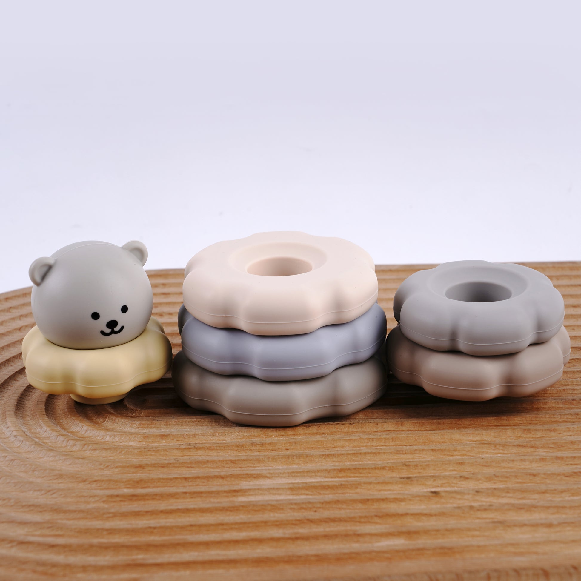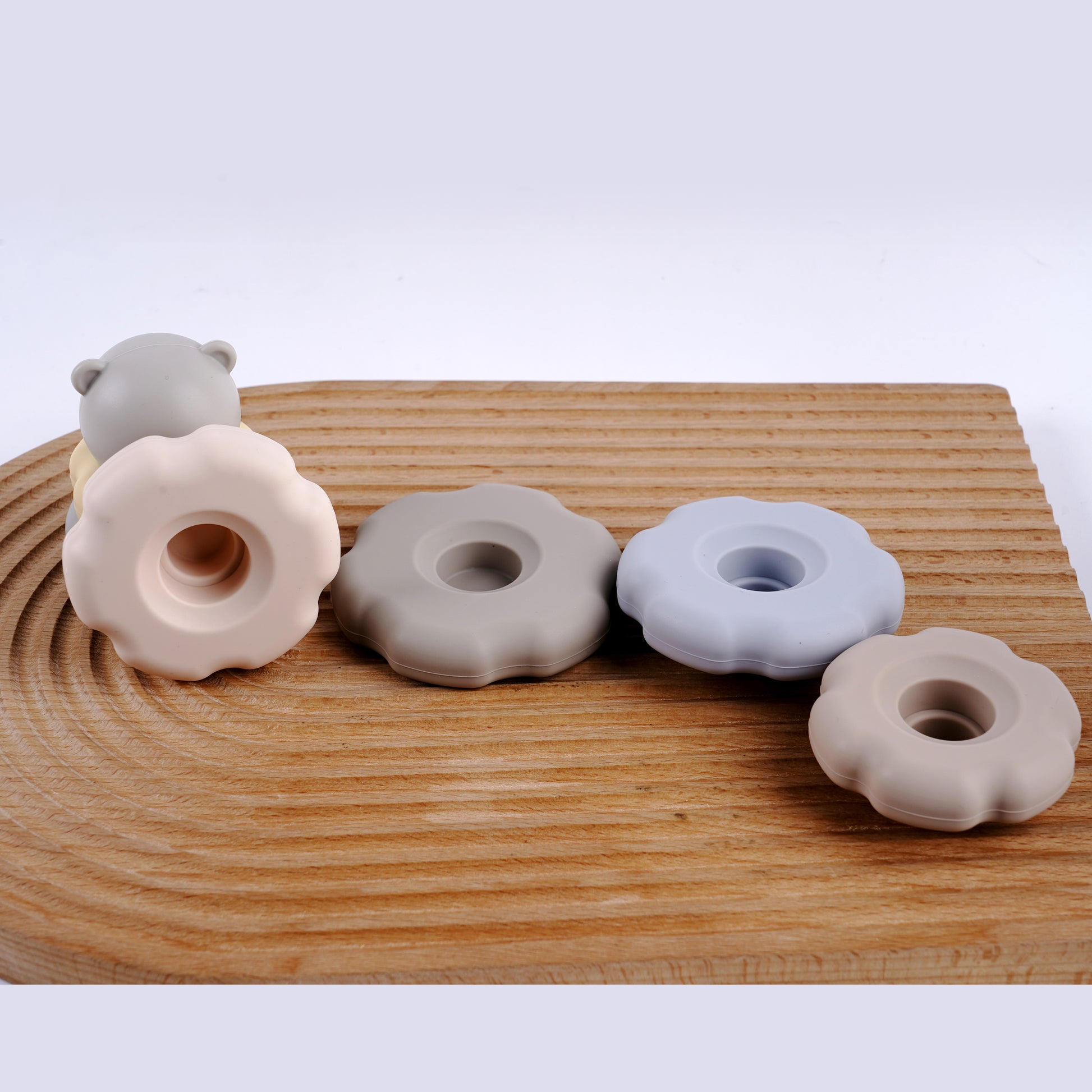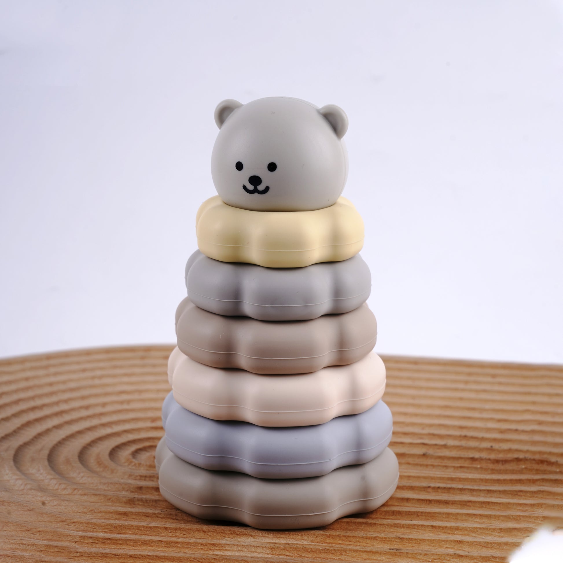 De stapeltoren bestaat uit meerdere bloemenring-vormen en een schattig beertje bovenop. Kinderen kunnen de ringen stapelen, sorteren, rollen en vasthouden — ideaal voor de ontwikkeling van motoriek, hand-oogcoördinatie en sensorisch spel.